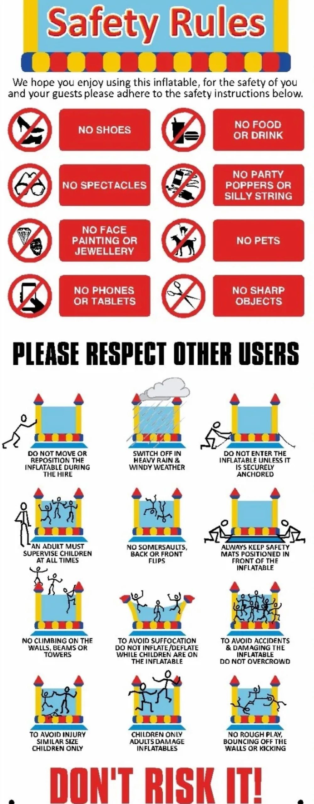 Indoor bouncy castle bookings are required during winter due to safety regulations and weather unpredictability. Strong winds, rain, cold temperatures, and unsuitable ground surfaces make outdoor use unsafe during this time of year and a higher risk of being cancelled